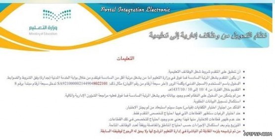 أنهت وزارة التعليم والخدمة المدنية ضوابط وشروط النقل من وظيفة إدارية إلى تعليمية، وسيتم فتح نظام التكامل بالتقديم اعتبارا من 1437/10/4 هـ حسب ما أفاد به المتحدث الرسمي لوزارة التعليم مبارك العصيمي عبر حسابه بتويتر
