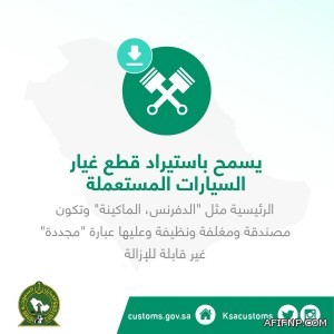 قالت الجمارك السعودية اليوم إنه يسمح باستيراد قطع غيار السيارات المستعملة الرئيسية مثل “الدفرنس” و”الماكينة”، مشيرة إلى أنه يجب أن تكون قطع الغيار مصندقة ومغلفة ونظيفة، وعليها عبارة “مجدّدة” غير قابلة للإزالة.