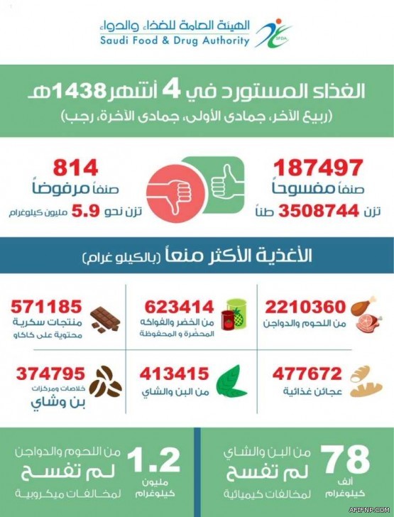 [JUSTIFY]رفضت الهيئة العامة للغذاء والدواء الإذن بفسح 814 صنفاً تزن نحو 5.9 ملايين كيلوغرام من المواد الغذائية المستوردة عبر منافذ المملكة، خلال أشهر (ربيع الثاني، وجمادى الأولى، وجمادى الآخرة، ورجب 1438هـ)، منها أكثر من 2210360 كيلوغراماً من اللحوم والدواجن.