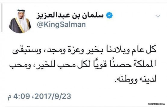 محليات > الملك سلمان عبر تويتر: كل عام وبلادنا بخير وعزة