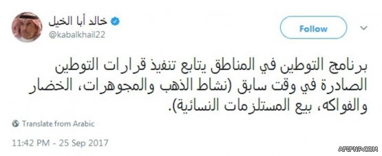 ووفقا للمتحدث باسم وزارة العمل والتنمية الاجتماعية خالد أبا الخيل، فإن قرارات التوطين شملت نشاط الذهب والمجوهرات، الخضار والفواكه، بيع المستلزمات النسائية.