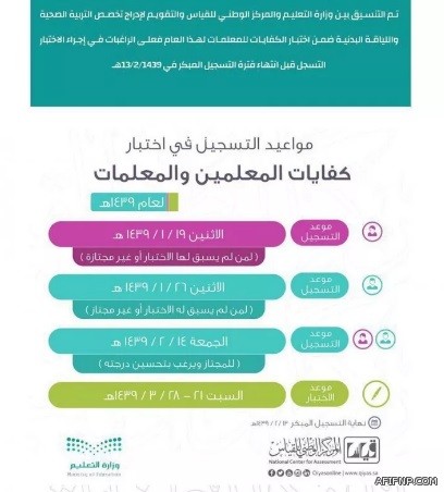وأوضح المتحدث للوزارة مبارك العصيمي، أنه تم التنسيق بين وزارة التعليم والمركز الوطني للقياس والتقويم لإدراج تخصص التربية الصحية واللياقة البدنية ضمن اختيار الكفايات للمعلمات لهذا العام، فعلى الراغبات في إجراء الاختبار التسجيل في انتهاء فترة التسجيل المبكر في 13/2/1439 هـ.