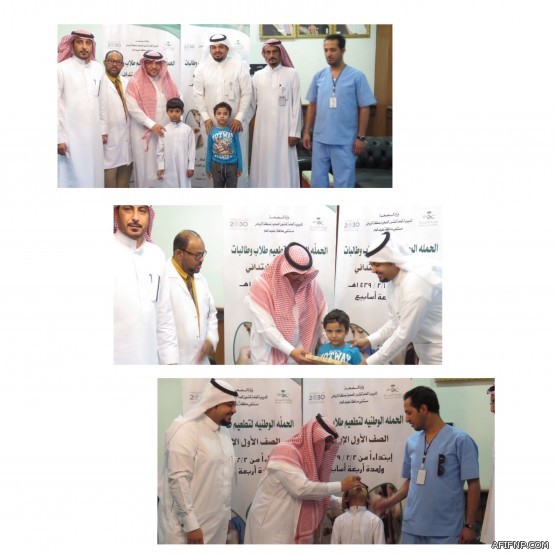 دشن محافظ عفيف الأستاذ رشيد بن سليمان الجبرين صباح اليوم الحملة الوطنية لتطعيم طلاب وطالبات مدارس المحافظة باللقاح الثلاثي الفيروسي والبكتيري وشلل الأطفال، للصف الأول الابتدائي، وتطعيم لقاح الجديري المائي للصف الأول والثاني الابتدائي بمدارس المحافظة والتي تأتي في إطار جهود وزارة الصحة لتفادي تلك الأمراض ،