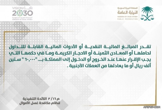 وأوضحت النيابة، في تغريدة لها عبر ?تويتر?، أنه يجب الإقرار عن المبالغ المالية النقدية، والأدوات المالية القابلة للتداول لحاملها، وأيضًا المعادن الثمينة أو الأحجار الكريمة وما في حكمها، والتي تقدر قيمتها بـ(60000) ستين ألف ريال أو تزيد، أو ما يعادلها من العملات الأجنبية.