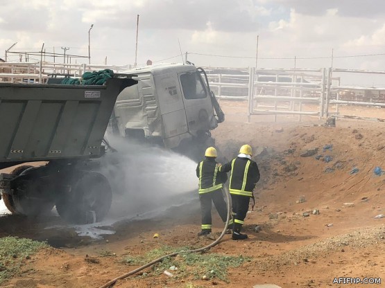 [CENTER]وقع ظهر اليوم الاحد بالدائري الجنوبي بالطريق المخصص للشاحنات حادث تصادم بين شاحنتين نتج عنه احتجاز في احد الشاحنات ( صهريج مياه ) وحريق في رأس الشاحنه الأخرى ( قلاب ) وتم مباشرة الحريق والاحتجاز من قبل فرق الدفاع المدني ، وتم اخراج المحتجز واخماد الحريق ونقل المصابين الى مستشفى عفيف بواسطة الهلال الاحمر واصابتهم متوسطه .[/CENTER]