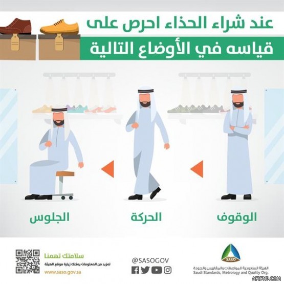 وأوضحت الهيئة في رسائلها التوعوية، أن المستهلك يجب عليه الحرص على قياس الحذاء، في ثلاثة أوضاع للحصول على حذاء مريح.