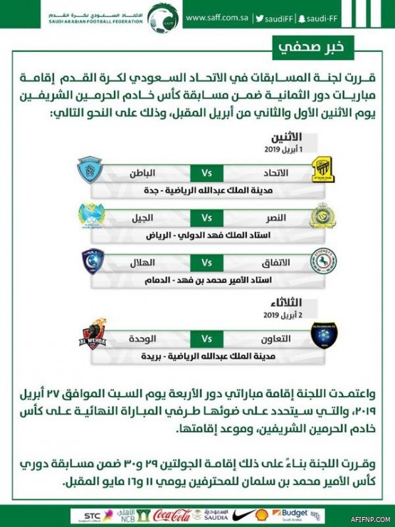 واعتمدت اللجنة في يوم الإثنين 1 أبريل، مباريات الاتحاد والباطن في مدينة الملك عبدالله الرياضية بجدة، والنصر والجيل في استاد الملك فهد بالرياض، والاتفاق والهلال في استاد الأمير محمد بن فهد بالدمام، وفي يوم الثلاثاء 2 أبريل مباراة التعاون والوحدة في مدينة الملك عبدالله الرياضية ببريدة.