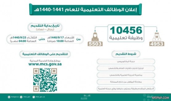 أعلنت “وزارة التعليم”، اليوم الأحد، بالتنسيق مع وزارة الخدمة المدنية عن توفير 10456 وظيفة تعليمية شاغرة، وحاجتها إلى شغلها بمواطنين ومواطنات مؤهلين؛ وفقًا للضوابط والإجراءات والمواعيد المعلنة، وذلك للعام الدراسي المقبل 1440هـ – 1441هـ.