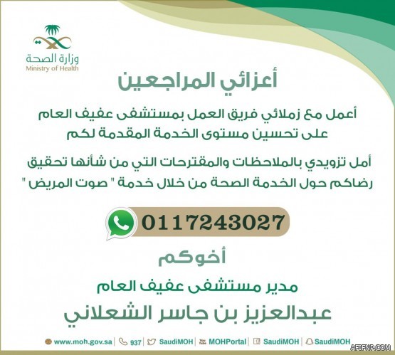 أطلقت إدارة مستشفى عفيف مؤخراً خدمة ” صوت المريض ” ، وكشف مدير مستشفى عفيف عبدالعزيز بن جاسر الشعلاني أن خدمة صوت المريض تهدف إلى ضمان وصول صوت المريض بالدرجة الأولى عبر قنوات متعددة وأهمها