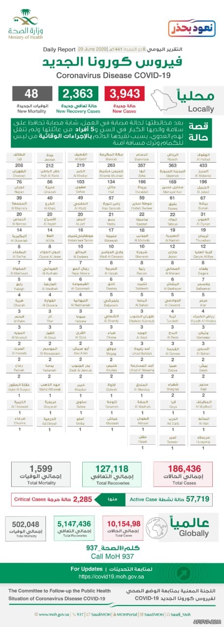 أعلن المتحدث الرسمي باسم وزارة الصحة، الدكتور محمد العبدالعالي، اليوم الاثنين، عن تسجيل 3943 حالة إصابة جديدة بفيروس كورونا المستجد COVID19 توزعت في مختلف مدن ومناطق المملكة.