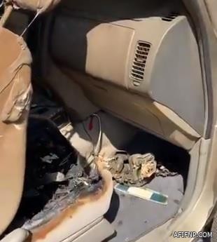 ونشر المختص في الكهرباء، منصور الشيبي، مقطع فيديو استعرض من خلاله الأضرار البالغة التي أصابت السيارة، والتي شملت المقاعد الأمامية والأبواب والسقف، بالإضافة إلى آثار أقل في الجزء الخلفي من السيارة.