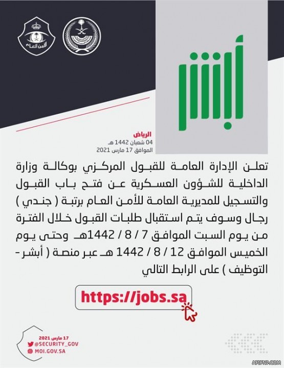 وأوضحت، اليوم (الأربعاء)، أنه سيتم استقبال الطلبات خلال الفترة من 20-25 مارس الجاري، عبر منصة “أبشر- التوظيف”.