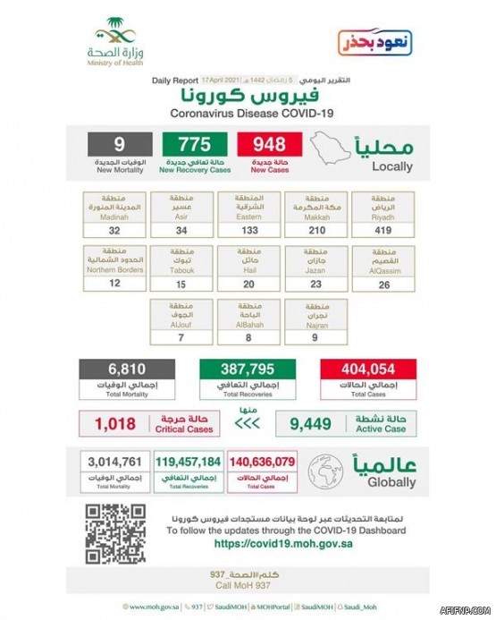 وأبانت أنه تم تسجيل 775 حالة تعافٍ جديدة، ليصل إجمالي عدد المتعافين إلى 387795 حالة، لافتة إلى أن هناك 9449 حالة نشطة حالياً، من بينها 1018 حالة حرجة.