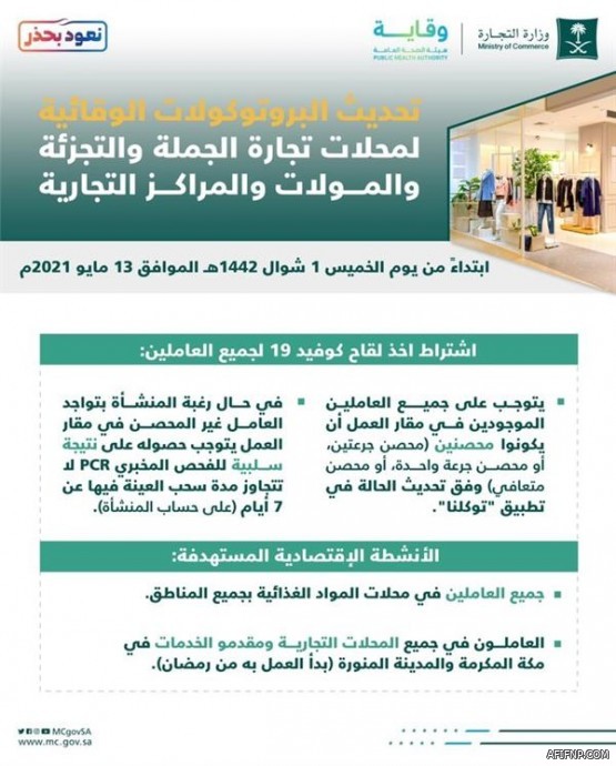أعلنت وزارة التجارة، اليوم الأربعاء، تحديث البروتوكولات الوقائية لمحلات تجارة الجملة والتجزئة والمولات والمراكز التجارية، وذلك ابتداء من يوم غد الخميس الموافق 1 شوال.