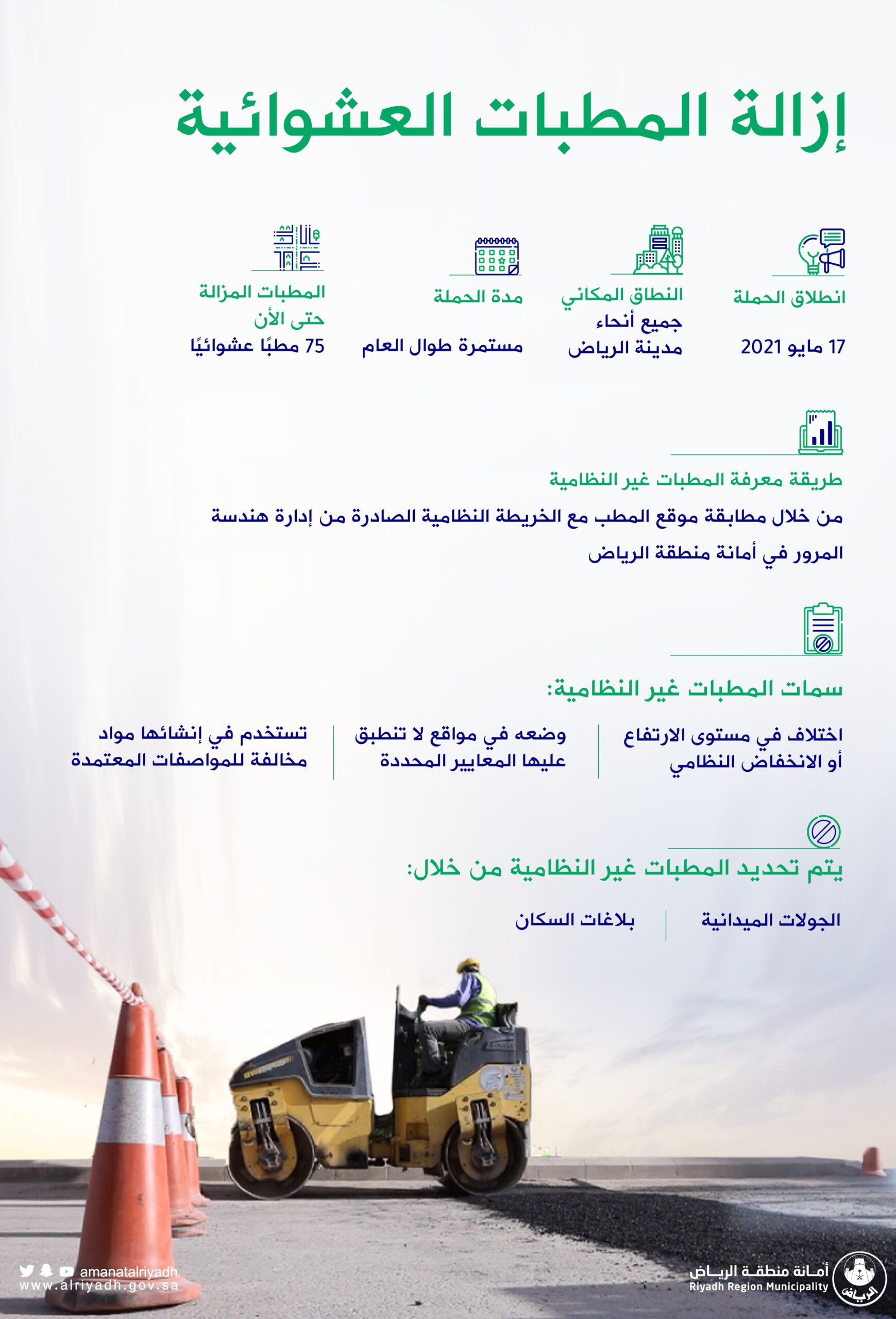 وبيّنت أمانة الرياض أن حملتها المكثفة مستمرة طوال العام، مشددة على ضرورة تقيُّد الجميع بالأنظمة والتعليمات، وعدم استحداث أي مطبات عشوائية من شأنها إعاقة سير المركبات والإضرار بها، والتأثير المباشر على جودة وكفاءة الطرق التي يتم تنفيذها وفق مواصفات ومعايير محددة.