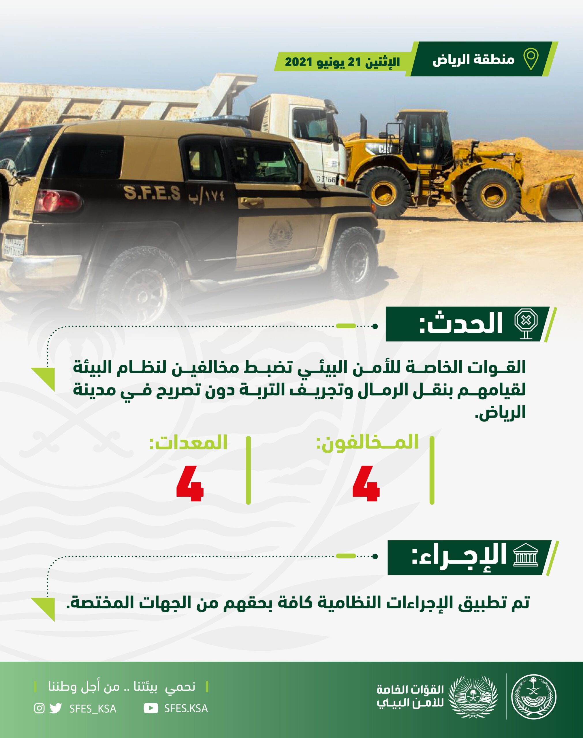 وأوضح المتحدث الرسمي للقوات الخاصة للأمن البيئي الرائد/ رائد المالكي، أنه تم ضبط (4) آليات تستخدم في نقل الرمال وتجريف التربة، تعود ملكيتها لمواطن، ويعمل عليها مقيمون من الجنسيات اليمنية والباكستانية والهندية وتم تطبيق الإجراءات النظامية كافة بحقهم من الجهات المختصة.