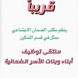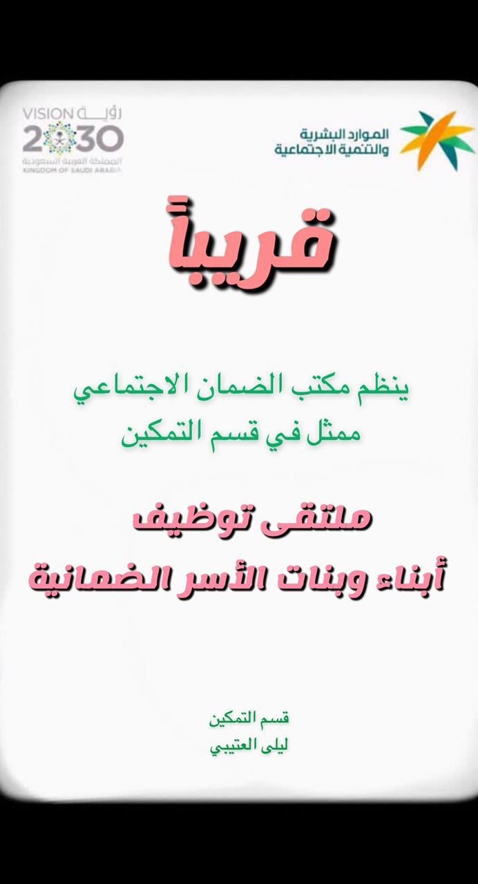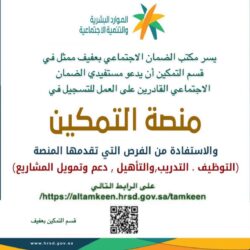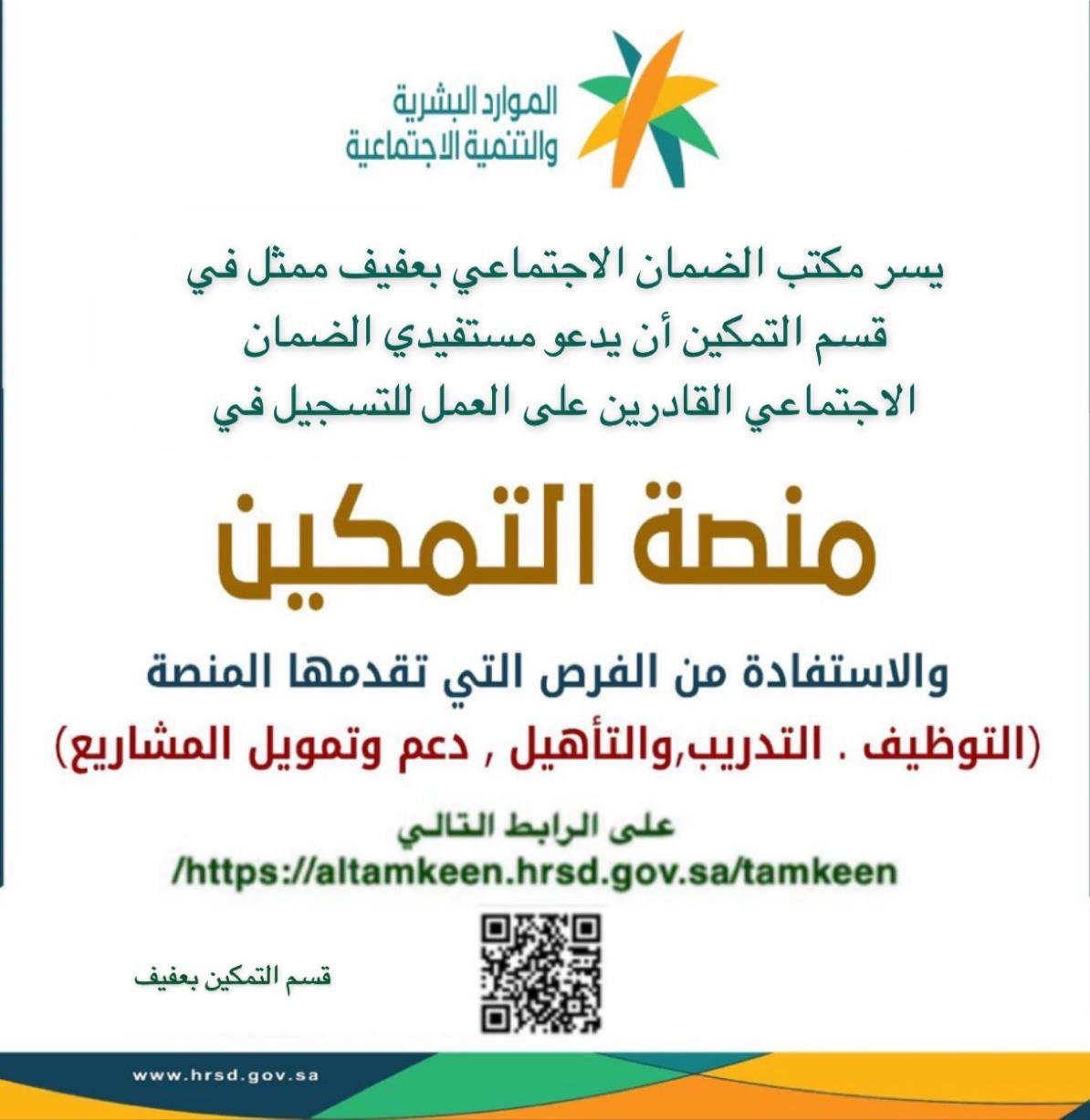 الضمان الإجتماعي بمحافظة عفيف يدعو مستفيديه القادرين على العمل بالتسجيل في “منصة التمكين”، للإستفادة من الفرص التيتقدمها المنصة مثل التوظيف والتدريب والتأهيل ودعم وتمويل المشاريع .