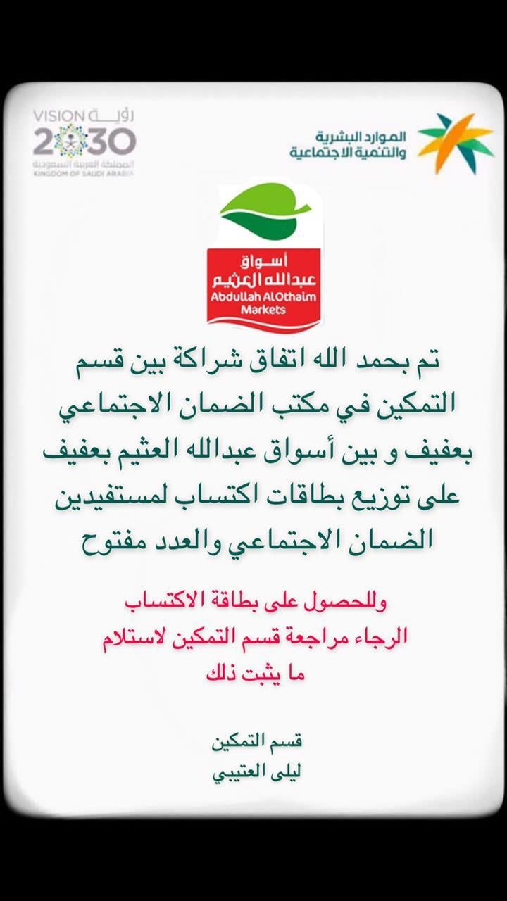 الجدير بأن قسم التمكين بمكتب الضمان الاجتماعي بعفيف عقد العديد من الشراكات المجتمعية مع العديد من القطاع الخاص لدعممستفيدي الضمان .