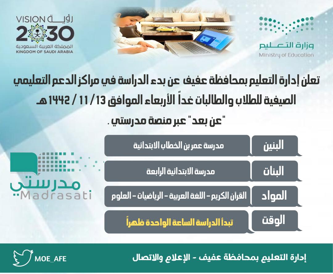 أعلنت إدارة تعليم عفيف عن بدء الدراسة في مراكز الدعم التعليمي الصيفية للطلاب والطالبات اليوم الأربعاء الموافق 13/ 11 / 1442هـ، والتي تنفذ “عن بعد” عبر منصة_مدرستي والتي تسهدف طلاب المرحلة الابتدائية بمدرسة عمر بن الخطاب والطالبات بالابتدائية الرابعة ابتداءً من الساعة الواحدة ظهراً .
