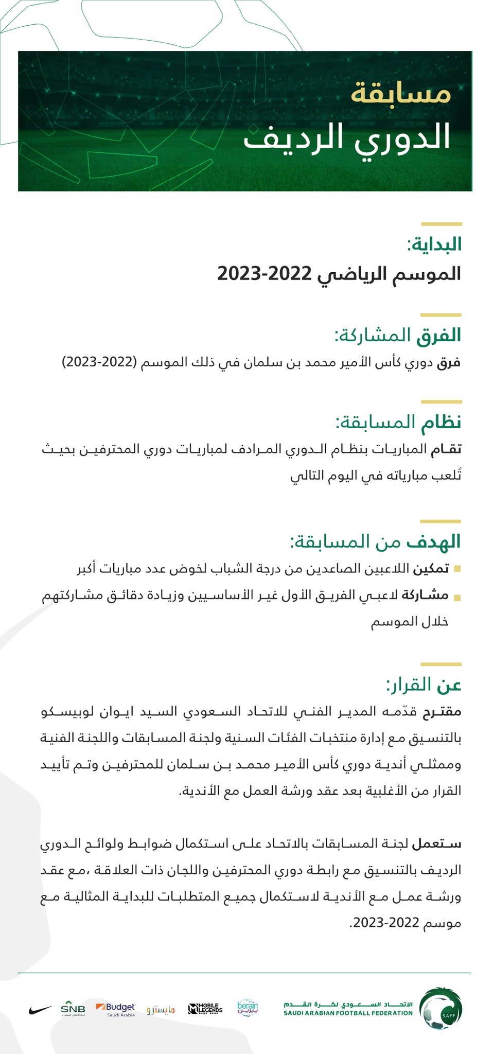 اعتمد مجلس إدارة الاتحاد السعودي لكرة القدم استحداث مسابقة الدوري الرديف اعتبارًا من الموسم الرياضي بعد القادم 2022-2023 بإتاحة الفرصة لكافة فرق دوري كأس الأمير محمد بن سلمان للمحترفين في ذلك الموسم المشاركة بالمسابقة.