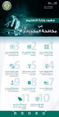 وتنسجم جهود وزارة التعليم مع توجهات المملكة في تطبيق معايير مكتب منظمة الأمم المتحدة لمكافحة الجريمة والمخدرات “UNODC” لدفع مشاركة الأفراد والمجتمعات المحلية والمنظمات المختلفة في جميع أنحاء العالم للاحتفال باليوم العالمي لمكافحة المخدرات، وزيادة الوعي بالمشكلة الرئيسة التي تسببها المخدرات في المجتمع، وتعزيز العمل الدولي لإيجاد مجتمع عالمي خالٍ من المخدرات.