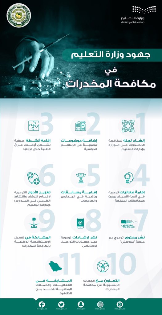 تشارك وزارة التعليم في اليوم العالمي لمكافحة المخدرات الذي يوافق 26 يونيو من كل عام؛ لإبراز جهود المملكة في مكافحة المخدرات محلياً ودولياً، ورفع الوعي المجتمعي بخطر المخدرات، وتعزيز التكامل مع الجهود الوطنية للحد من آثارها على الفرد والمجتمع، من خلال الوحدات التعليمية والإثراءات والتطبيقات في المناهج، والبرامج والفعاليات المتنوعة، بما يسهم في تحصين الطلبة، واستثمار أوقاتهم، وإكسابهم المعارف والمهارات الحياتية لبناء شخصيتهم الوطنية، ومشاركتهم الفاعلة في التنمية المجتمعية.