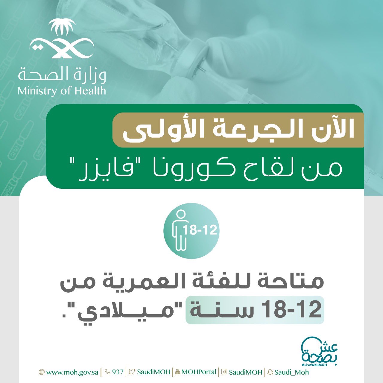 أعلنت وزارة الصحة تنفيذ مرحلة جديدة من الحملة الوطنية للتحصين بلقاح كورونا حيث سيجري البدء في إعطاء لقاح “فايزر” للفئة العمرية من (12-18) سنة بالتاريخ الميلادي, وذلك بعد موافقة الهيئة العامة للغذاء والدواء واستكمال جميع الدراسات العلمية, التي أكدت فاعلية اللقاح ونتائجه لهذه الفئة.