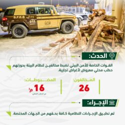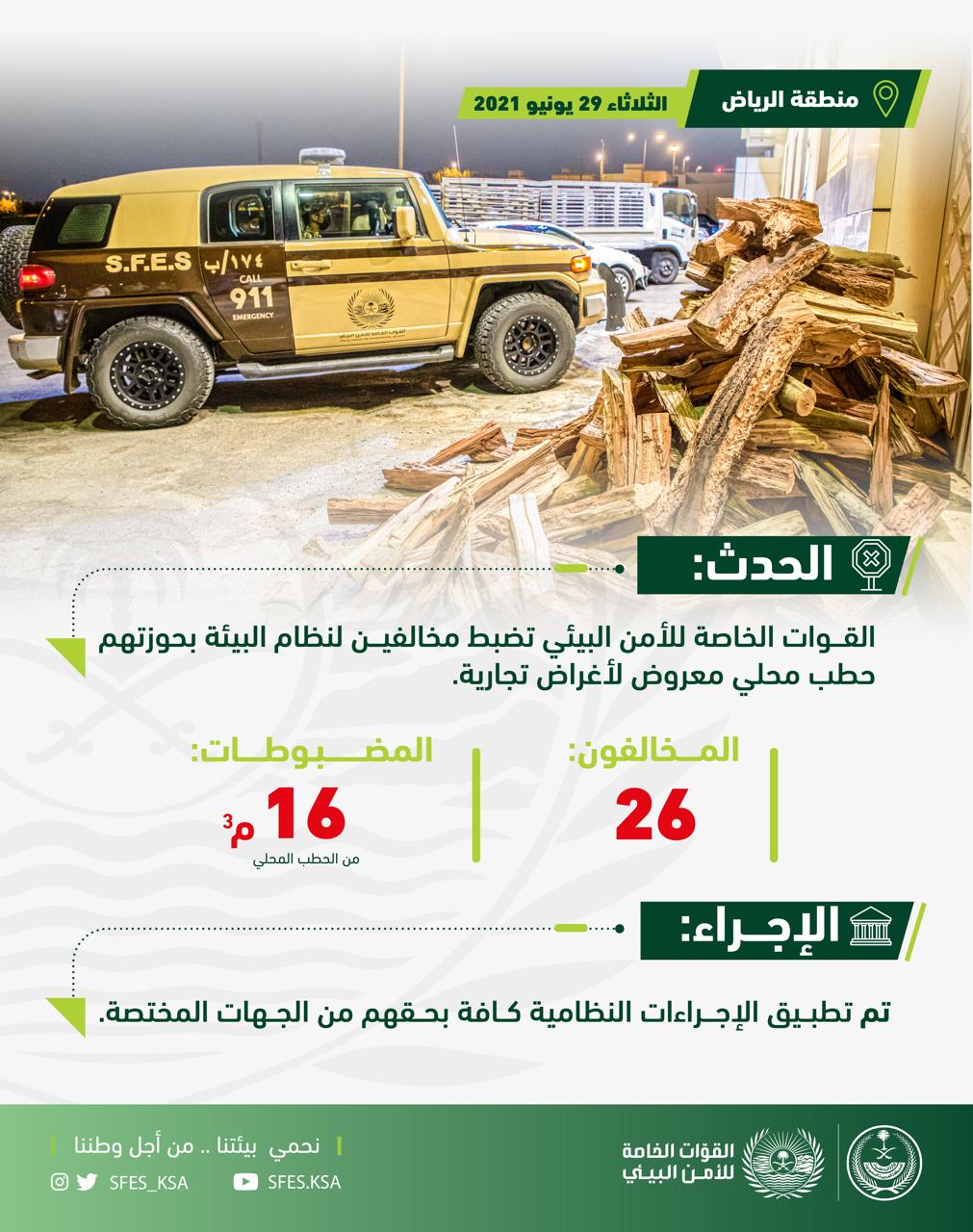 ضبطت القوات الخاصة للأمن البيئي بالتعاون مع أمانة منطقة الرياض (26) مواطنًا مخالفًا لنظام البيئة بحوزتهم (16) مترًا مكعبًا من الحطب المحلي المعروض لأغراض تجارية بمدينة الرياض.