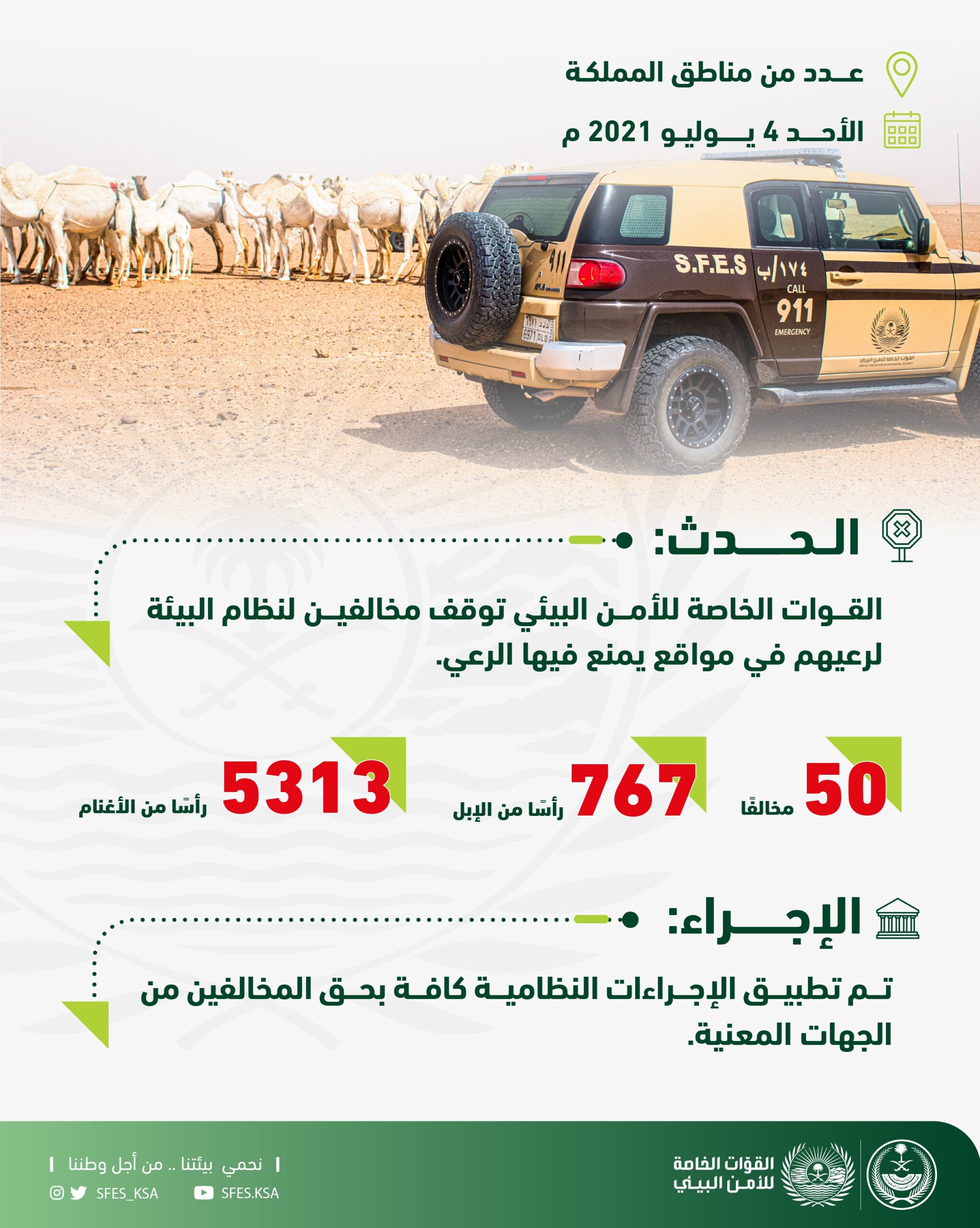 أوقفت القوات الخاصة للأمن البيئي (50) مخالفًا لنظام البيئة، منهم (22) مواطنًا و(28) مقيمًا، من الجنسيات السودانية والباكستانية والهندية، ارتكبوا مخالفات رعي (767) رأسًا من الإبل و(5313) رأسًا من الأغنام في أماكن يمنع فيها الرعي في عدد من مناطق المملكة.