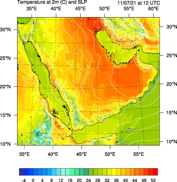 وتشمل تلك المناطق المنطقة الشرقية؛ حيث يتوقع أن تتراوح درجات الحرارة العظمى عليها ما بين ٤٨-٥٠ درجة مئوية، بينما تكون ما بين ٤٥-٤٨ درجة مئوية على أجزاء من مناطق الرياض والحدود الشمالية والمدينة المنورة.