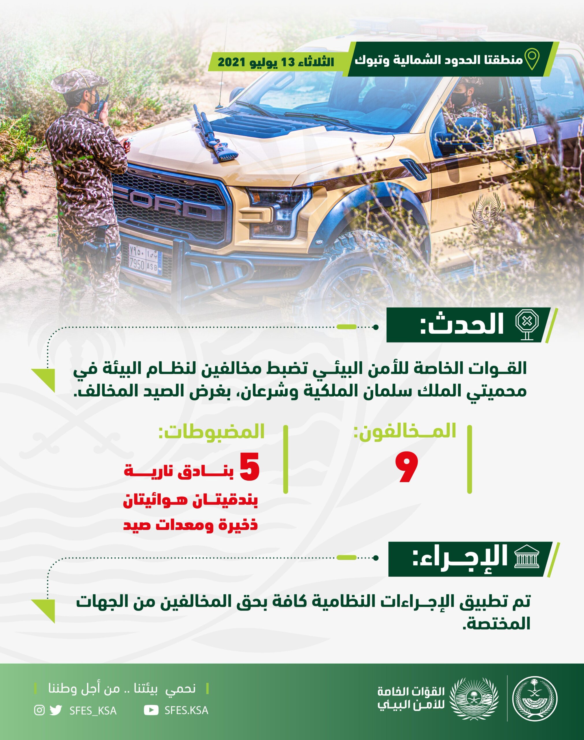 ضبطت القوات الخاصة للأمن البيئي، (9) مخالفين لنظام البيئة في محميتي الملك سلمان الملكية وشرعان، بغرض الصيد المخالف، بحوزتهم (5) بنادق نارية وبندقيتان هوائيتان، إضافة إلى ذخيرة ومعدات صيد متنوعة.