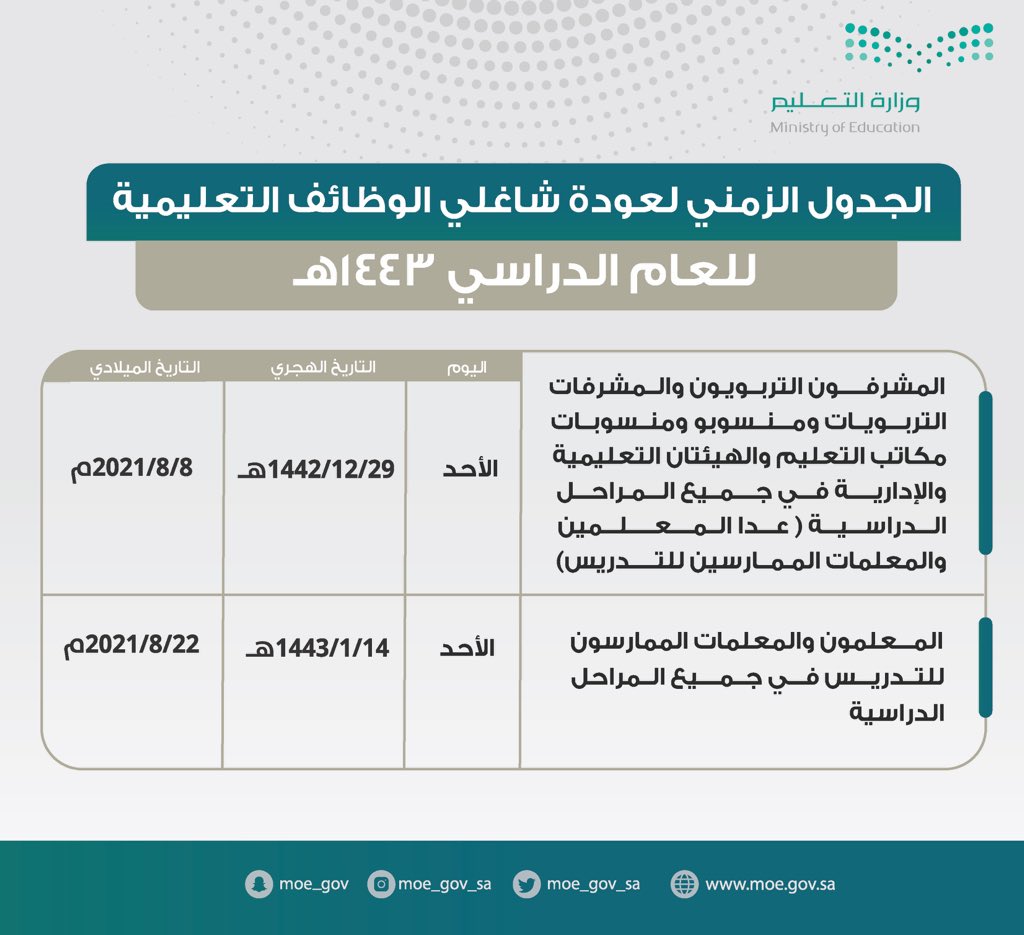 أعلنت وزارة التعليم عودة شاغلي الوظائف التعليمية للعام الدراسي ١٤٤٣هـ.