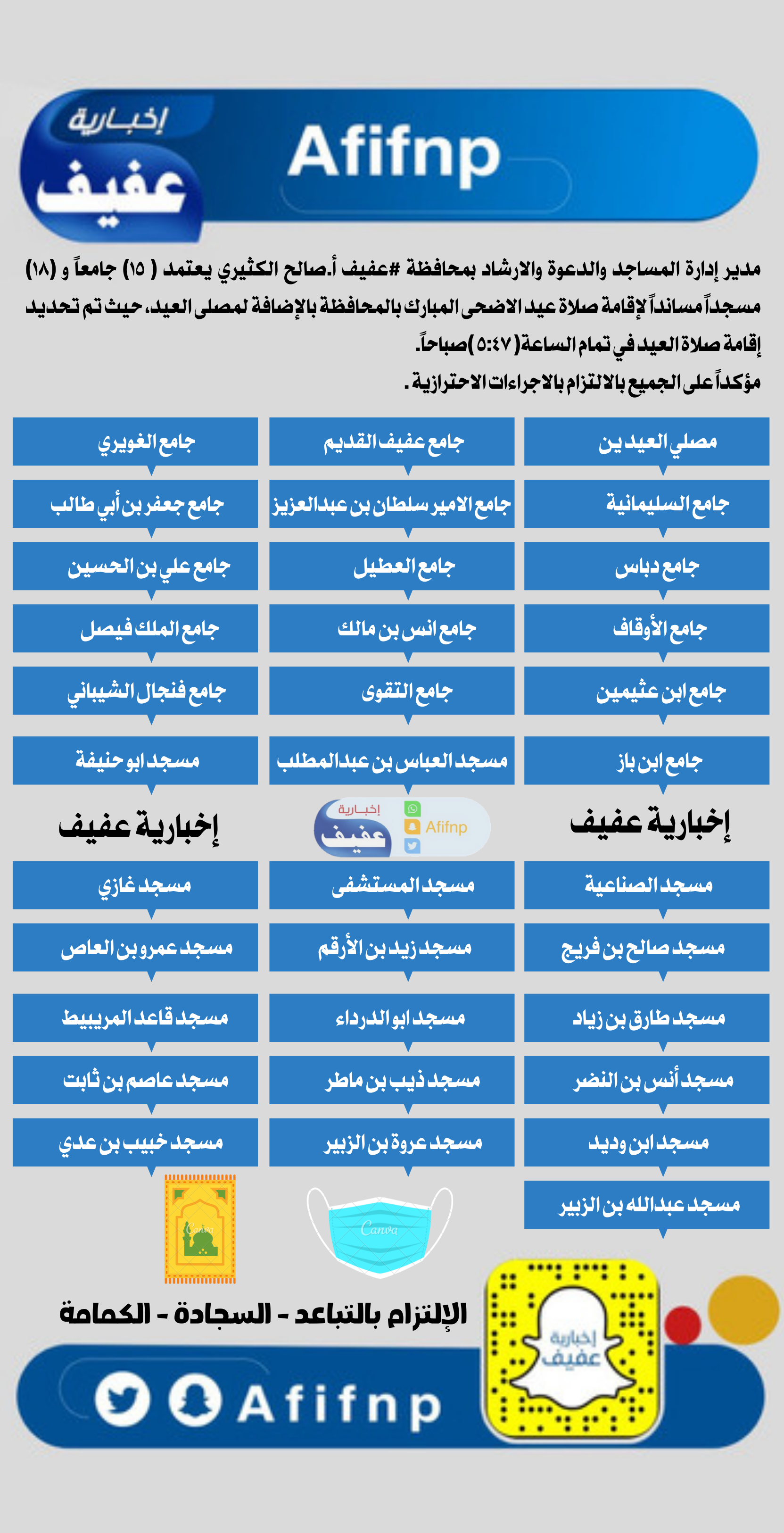 مدير إدارة المساجد والدعوة والارشاد بمحافظة عفيف أ.صالح الكثيري يعتمد ( ١٥) جامعاً و (١٨) مسجداً مسانداً لإقامة صلاة عيد الاضحى المبارك لعام ١٤٤٢هـ بالمحافظة بالإضافة لمصلى العيد، حيث تم تحديد إقامة صلاة العيد في تمام الساعة( ٥:٤٧ )صباحاً.