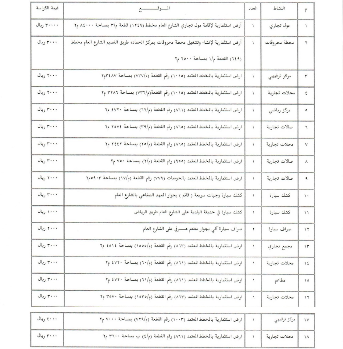 وقد شملت الفرص الاستثمارية، سوقاً تجارياً “مول” يقع على مساحة (84) ألف متر مربع، وأرضاً لإنشاء وتشغيل محطة وقود في مركز الحمادة على طريق عفيف – القصيم، ومراكز ترفيهية على مساحة 10400 متر مربع بطوابق متعددة وخدمات لكافة الشرائح وآخر رياضي على مساحة 4700 متر مربع، وصالات ومحلات تجارية متعددة بمساحات مختلفة وأكشاك سيارات وموقع صراف آلي ومجمعاً تجارياً ومطاعم.