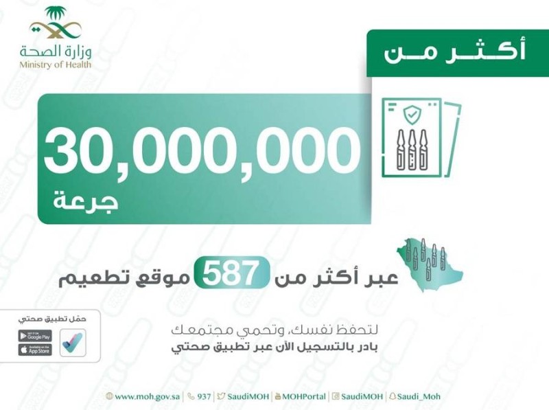 أعلنت وزارة الصحة اليوم (الاثنين) إعطاء أكثر من 30 مليون جرعة من اللقاحات المضادة لفايروس كورونا المستجد «كوفيد-19» حتى اليوم، وذلك عبر أكثر من 587 موقعا للتطعيم في كافة مناطق المملكة.