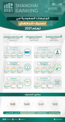 حققت 6 جامعات سعودية إنجازاً وطنياً وتقدماً علمياً وأكاديمياً؛ وفق أشهر مراكز التصنيفات العالمية (شنغهاي) لعام 2021م مقارنةً بالعام الماضي الذي حققت فيه 4 جامعات سعودية مراكز متقدمة في التصنيف.
