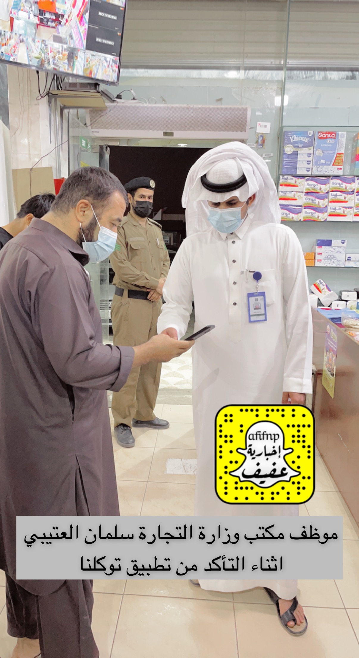 واصلت لجنة متابعة المحلات التجارية ومدى تطبيقها للإجراءات الاحترازية المشكلة من الجهات الأمنية والخدمية بمحافظة عفيف، جولاتهالضبط مخالفي الإجراءات الاحترازية والتدابير الوقائية، ومتابعة تطبيق توكلنا، وعدم لبس الكمامة الطبية أو القماشيةللحد من انتشار فيروسكورونا المستجد كوفيد 19 بالمحافظة .