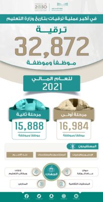 أنهت وزارة التعليم ترقية 32.872 موظفاً وموظفة خلال العام المالي 2021، وذلك في أكبر عدد ترقيات في تاريخها خلال عام واحد، حيث تم اليوم الإعلان عن ترقية 15.888 موظفاً وموظفة من منسوبيها على سلم وظائف الإداريين والإداريات والمستخدمين وبند الأجور في ديوان الوزارة، وإدارات التعليم (المكاتب والمدارس)، والملحقيات الثقافية، كما تم في وقت سابق من هذا العام الإعلان عن ترقية 16.984 موظفاً وموظفة.