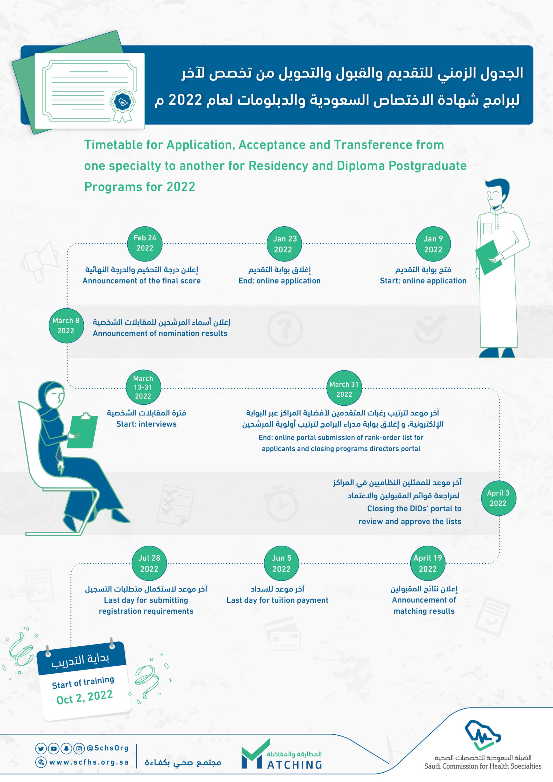 أعلنت الهيئة السعودية للتخصصات الصحية، بدء التقديم لبرامج شهادة الاختصاص السعودية والدبلومات لعام 2022، عبر بوابة المفاضلة والقبول الإلكترونية