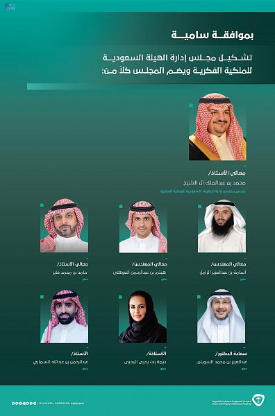 وتضمنت الموافقة على تعيين معالي المهندس أسامة بن عبدالعزيز الزامل، ومعالي المهندس هيثم بن عبدالرحمن العوهلي، ومعالي الأستاذ حامد بن محمد فايز، و ديمة بنت يحيى اليحيى، و عبدالرحمن بن عبدالله السماري، أعضاءً في مجلس إدارة الهيئة السعودية للملكية الفكرية، إضافةً إلى رئيس مجلس الإدارة معالي الأستاذ محمد بن عبدالملك آل الشيخ، وعضوية الرئيس التنفيذي للهيئة الدكتور عبدالعزيز بن محمد السويلم، وفقاً للمادة (الرابعة) من تنظيم الهيئة .