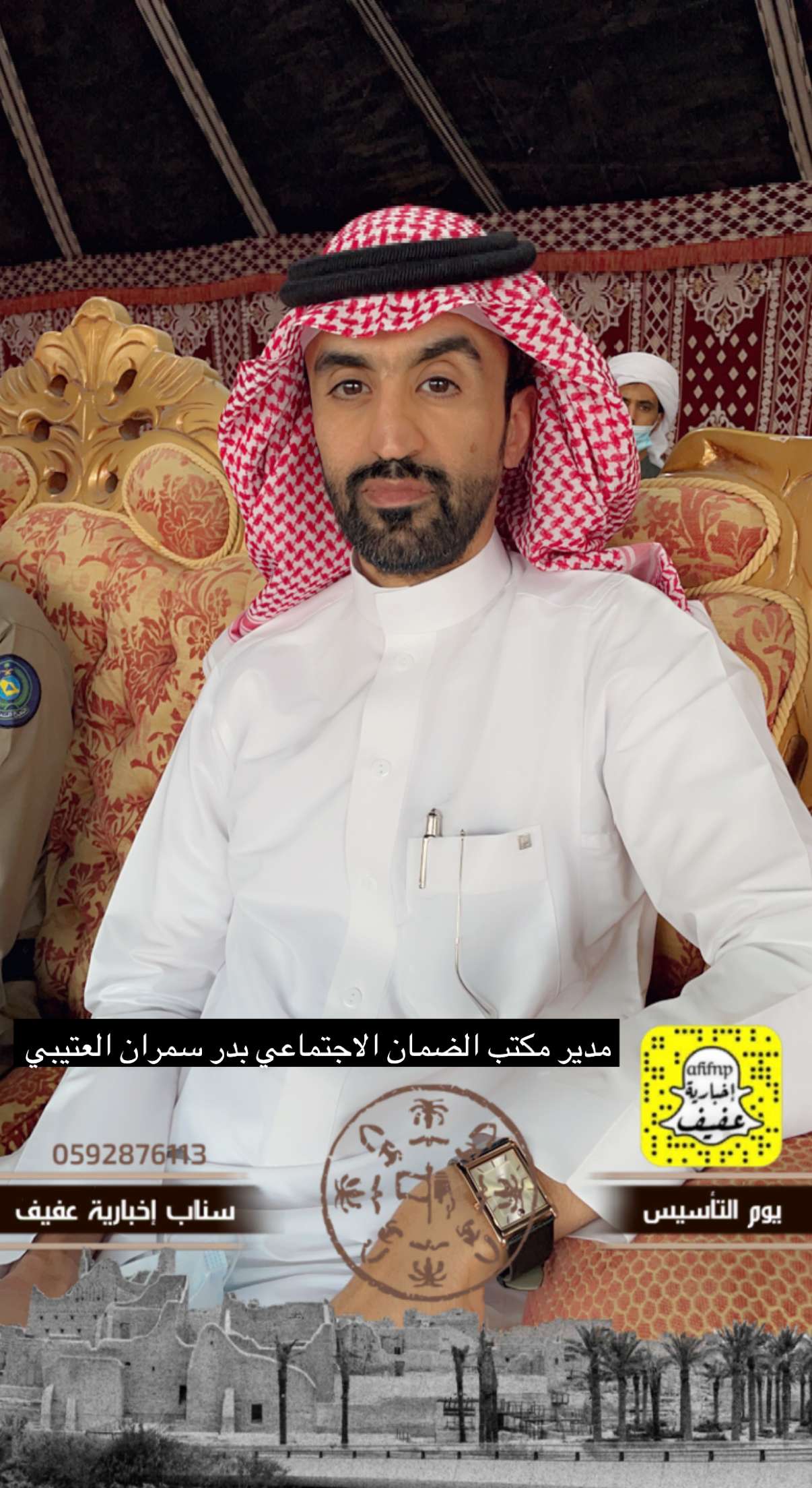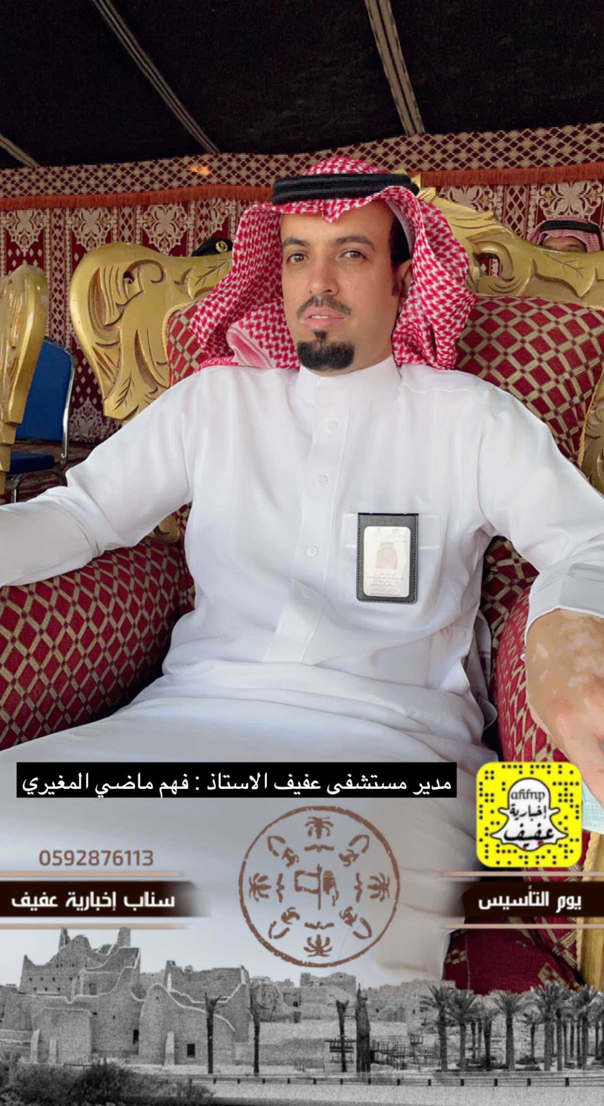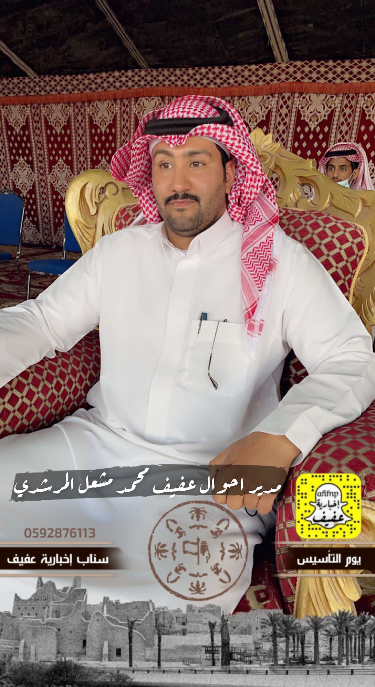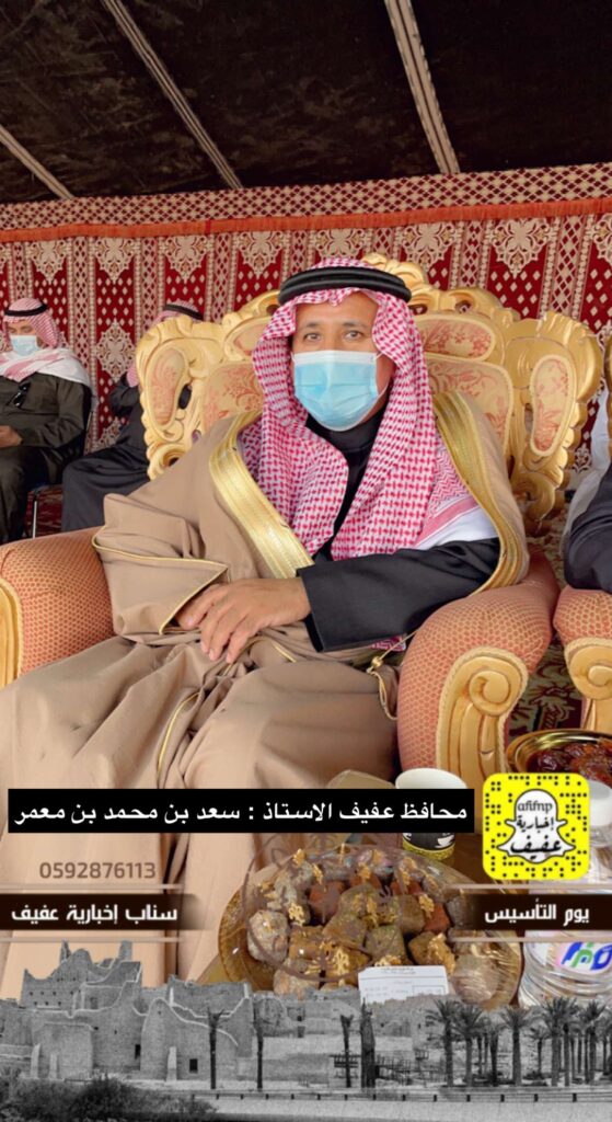 برعاية محافظ عفيف الأستاذ: سعد بن محمد بن معمر، انطلقت فعالياتالاحتفاء بيوم التأسيس بالمحافظة بحضور رؤساء الدوائر الحكوميةالمدنية والأمنية بفعاليات تنوعت ما بين عرض الفنون الشعبية القديمة والفرق الترفيهية
