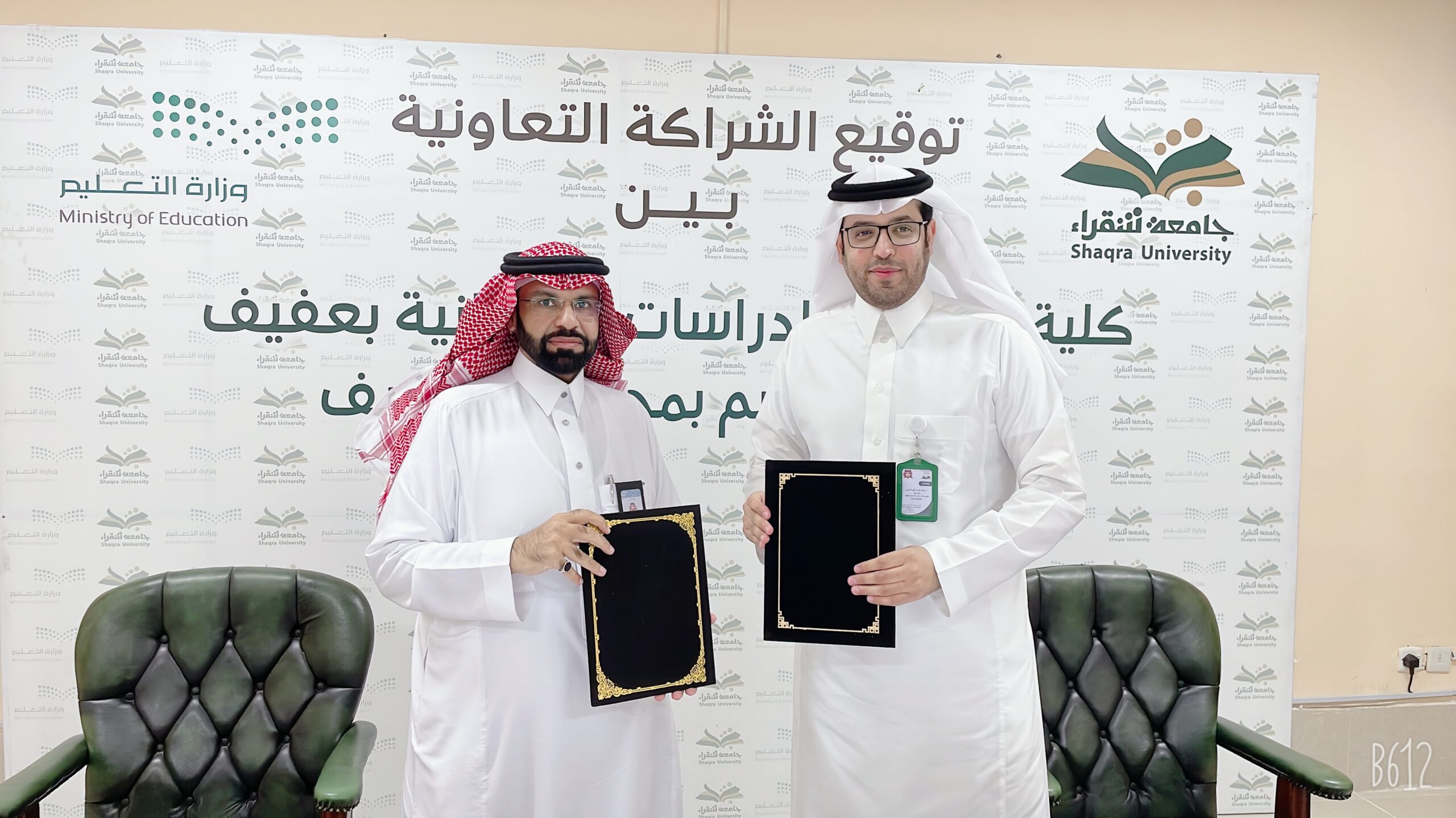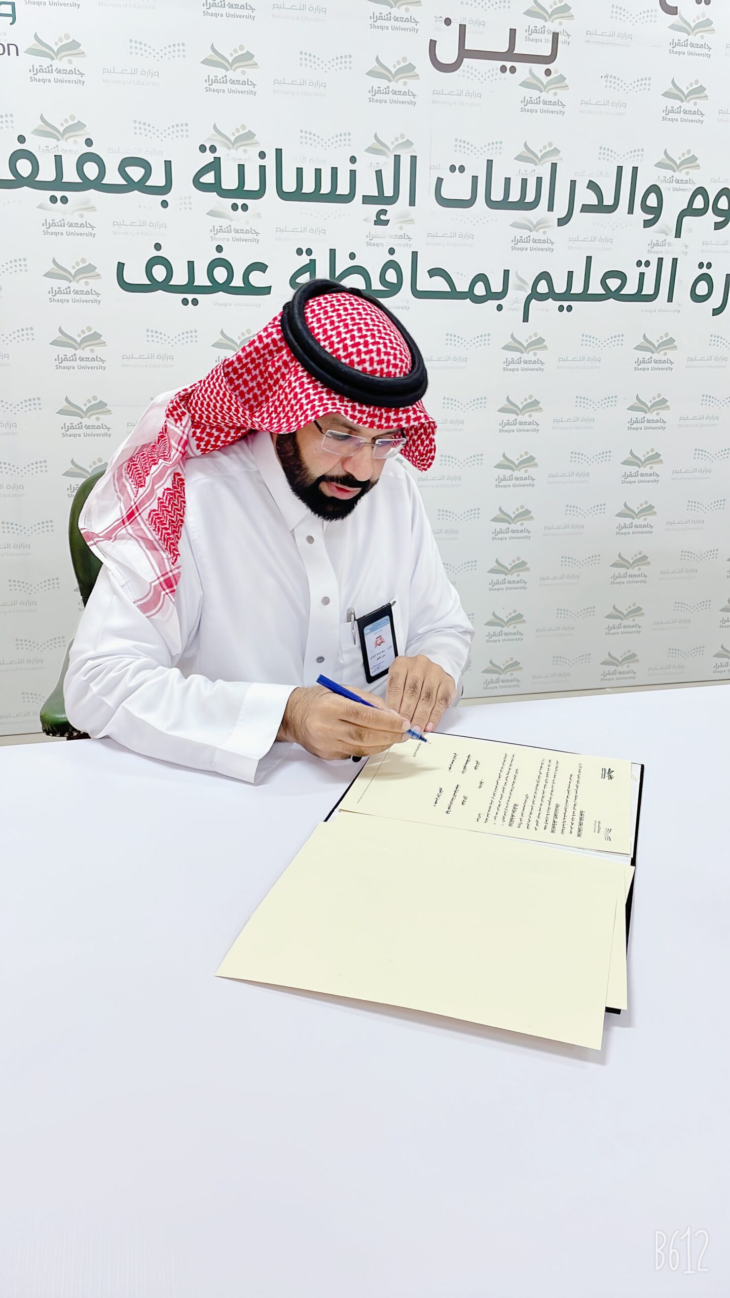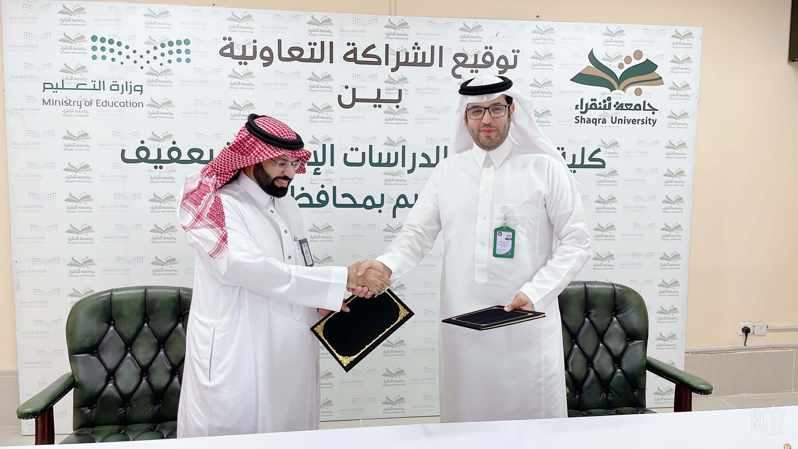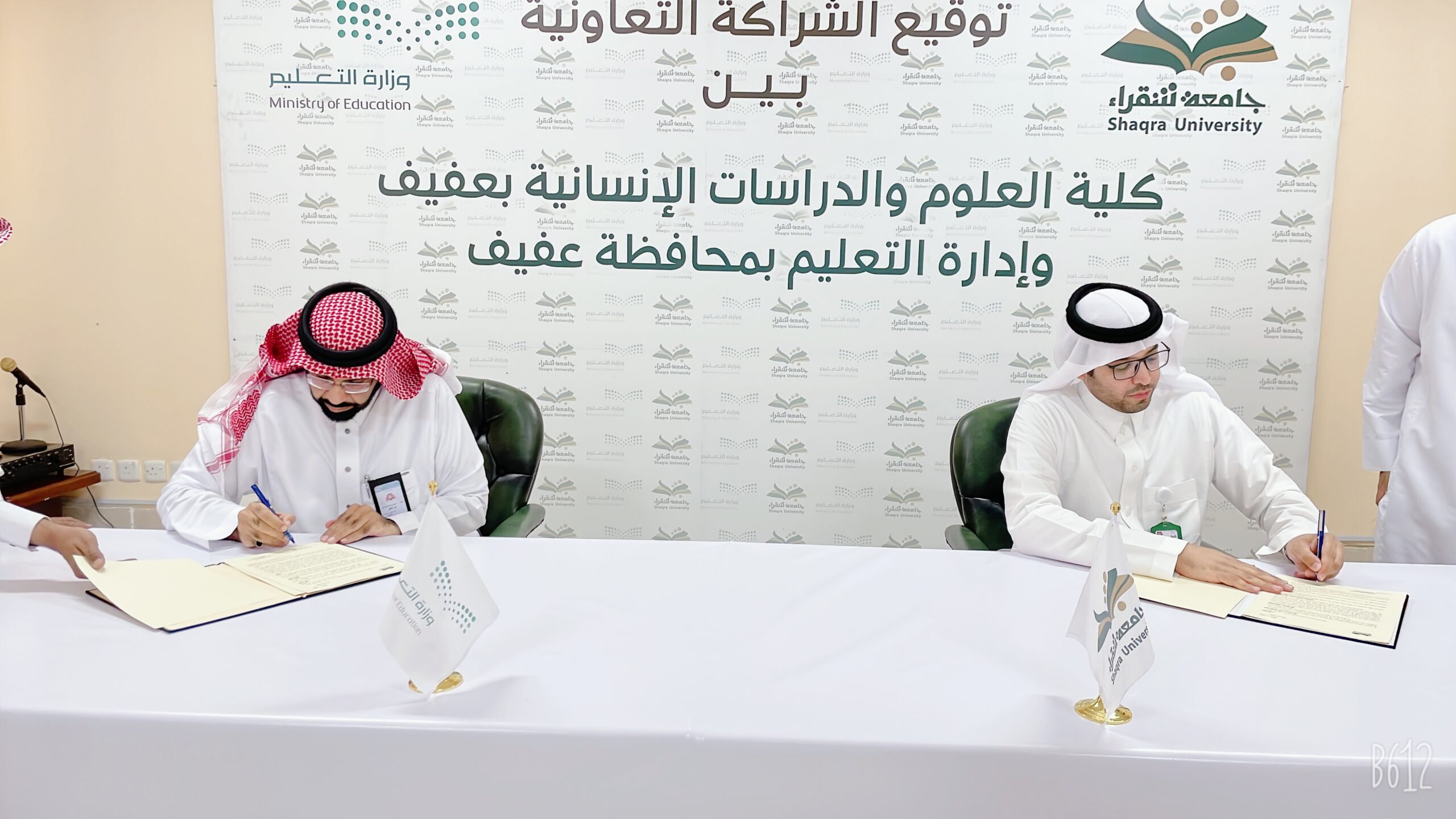 وقع سعادة عميد كلية العلوم والدراسات الإنسانية الدكتور: محمد حوال العضياني وسعادة مدير تعليم عفيف الاستاذ : سعيد بن مساعد الزهراني عقد الشراكة التعاونية بين كلية العلوم والدراسات الإنسانية وإدارة التعليم في مجال التدريب والاستفادة من الموارد والكوادر البشرية والاستشارية.