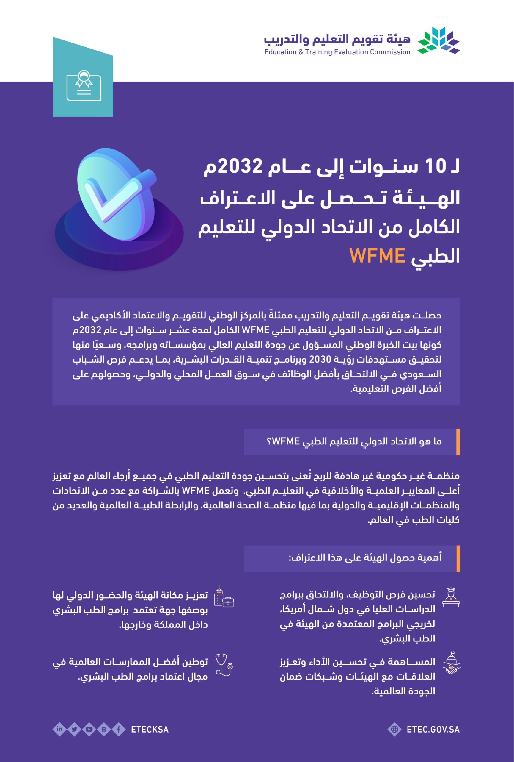 حصلت هيئة تقويم التعليم والتدريب،ممثلة بالمركز الوطني للتقويم والاعتماد الأكاديمي “اعتماد”، على اعتراف كامل من الاتحاد العالمي للتعليم الطبي (WFME) لمدة عشر سنوات إلى عام 2032م، وذلك بعد مرورها بتقييم شامل لعمليات الاعتماد الأكاديمي لبرامج الطب متضمنة معايير الاعتماد وسياساته وإجراءاته المطبقة، وتشكيل فرق المراجعة وجودتها ومناسبة خبرات المشاركين فيها، وآليات اتخاذ القرار ومصداقيته ودقة أحكامه.