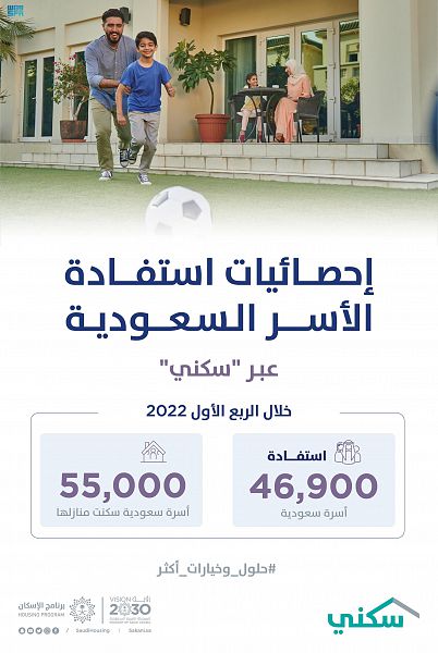 يُذكر أن برنامج “سكني” أعلن عن استفادة أكثر من 225 ألف أسرة سعودية خلال العام الماضي 2021، منها ما يزيد عن 186 ألف أسرة سكنت منازلها، ويستهدف “سكني” خلال العام 2022 استفادة 180 ألف أسرة من الخيارات والحلول التمويلية والسكنية المتنوعة، منها 130 ألف أسرة تسكن منازلها، وتقديم 100 ألف قرض مدعوم.