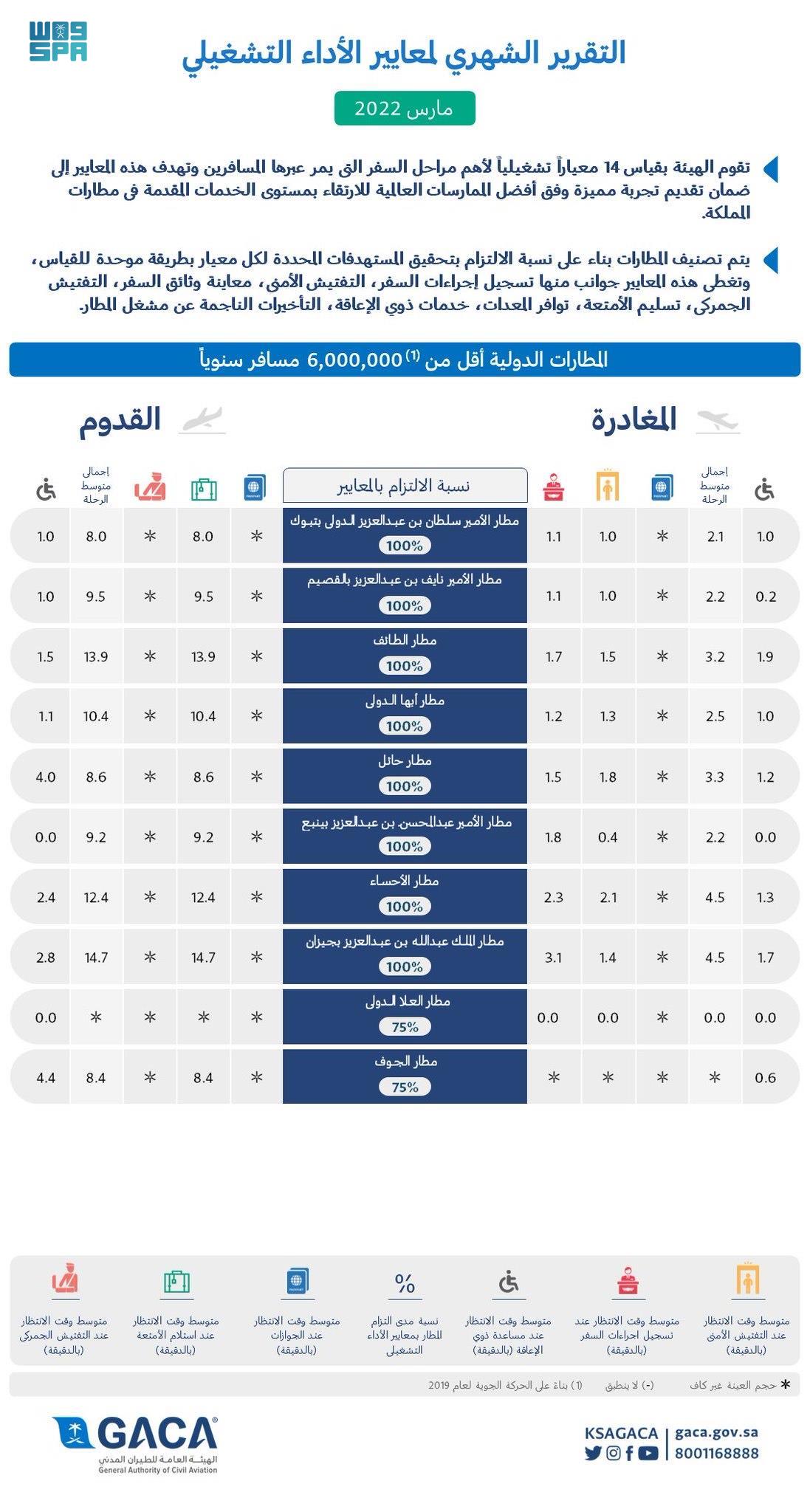 أصدرت الهيئة العامة للطيران المدني اليوم تقريرها الشهري عن أداء مطارات المملكة الدولية والمحلية، وذلك لشهر مارس 2022م، وفقاً لأربعة عشر معياراً أساسياً لقياس الأداء، وتأتي تطبيقاً للتوجُّهات الإستراتيجية التي تستهدف تجويد الخدمات المُقدَّمة للمسافرين، ورفع مستواها، وتحسين تجربة المسافر في مطارات المملكة.