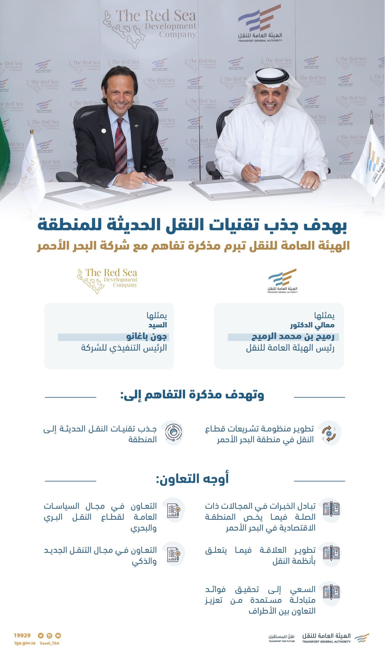 يذكر أن مذكرة التفاهم الموقعة بين الهيئة العامة للنقل وشركة البحر الأحمر للتطوير ستسهم في تبني التقنية المستقبلية والحديثة في مجالات النقل، وستتيح للجهتين تبادل الدراسات العلمية والخبرات العملية وعقد ورش العمل المتعلقة بوسائل النقل الحديث في خدمات التنقل، والعمل على توفير بيئة مناسبة للمستثمرين في مجال النقل والخدمات اللوجستية، والتعاون في مجال التنقل الجديد والذكي، والعمل على تحقيق النتائج والأهداف المرجوة لهذه الشراكة.