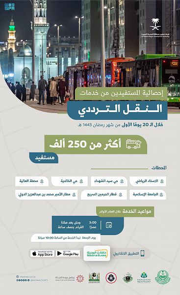 قدمت خدمات النقل الترددي من منظومة حافلات المدينة لنقل المصلين من وإلى المسجد النبوي الشريف، خدماتها لأكثر من 250 ألف مستفيد، وذلك خلال الفترة من 1 وحتى 20 رمضان الجاري.
