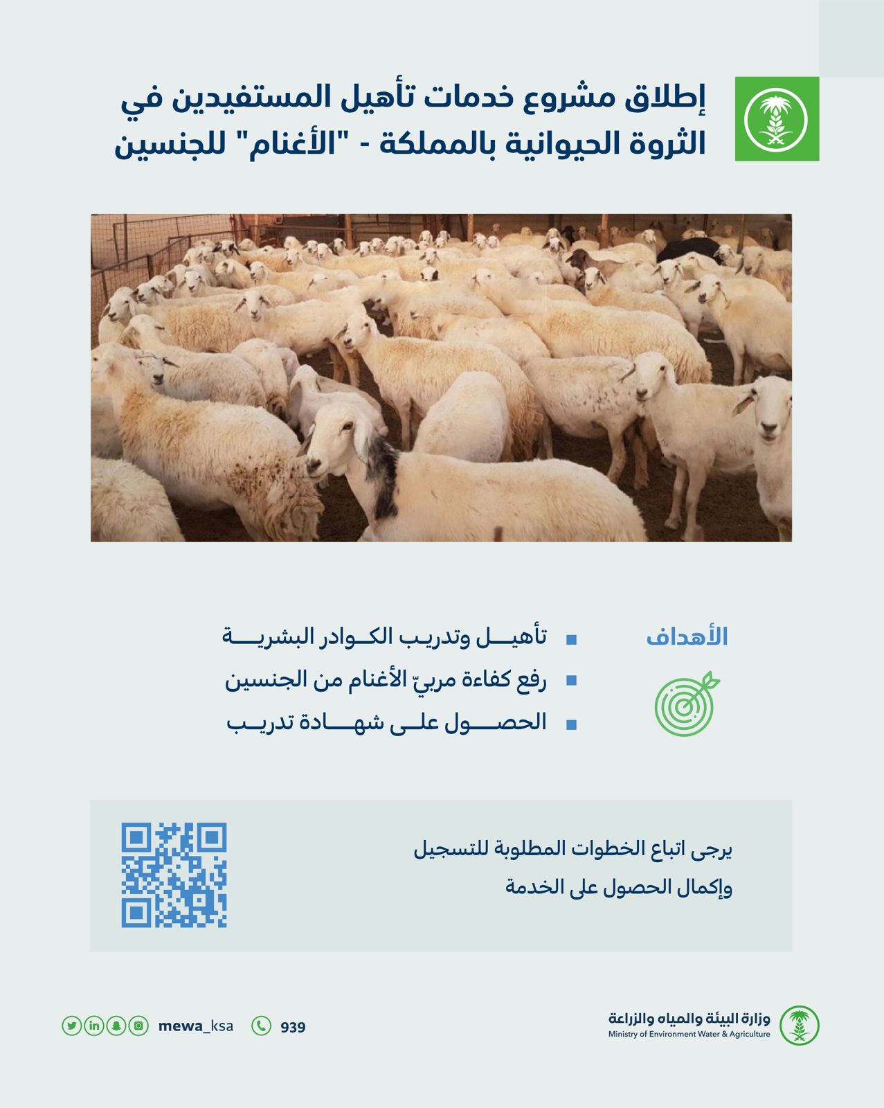 أطلقت وزارة البيئة والمياه والزراعة، مشروع تقديم خدمات تأهيل المستفيدين في قطاع الثروة الحيوانية “الأغنام” في جميع مناطق المملكة.