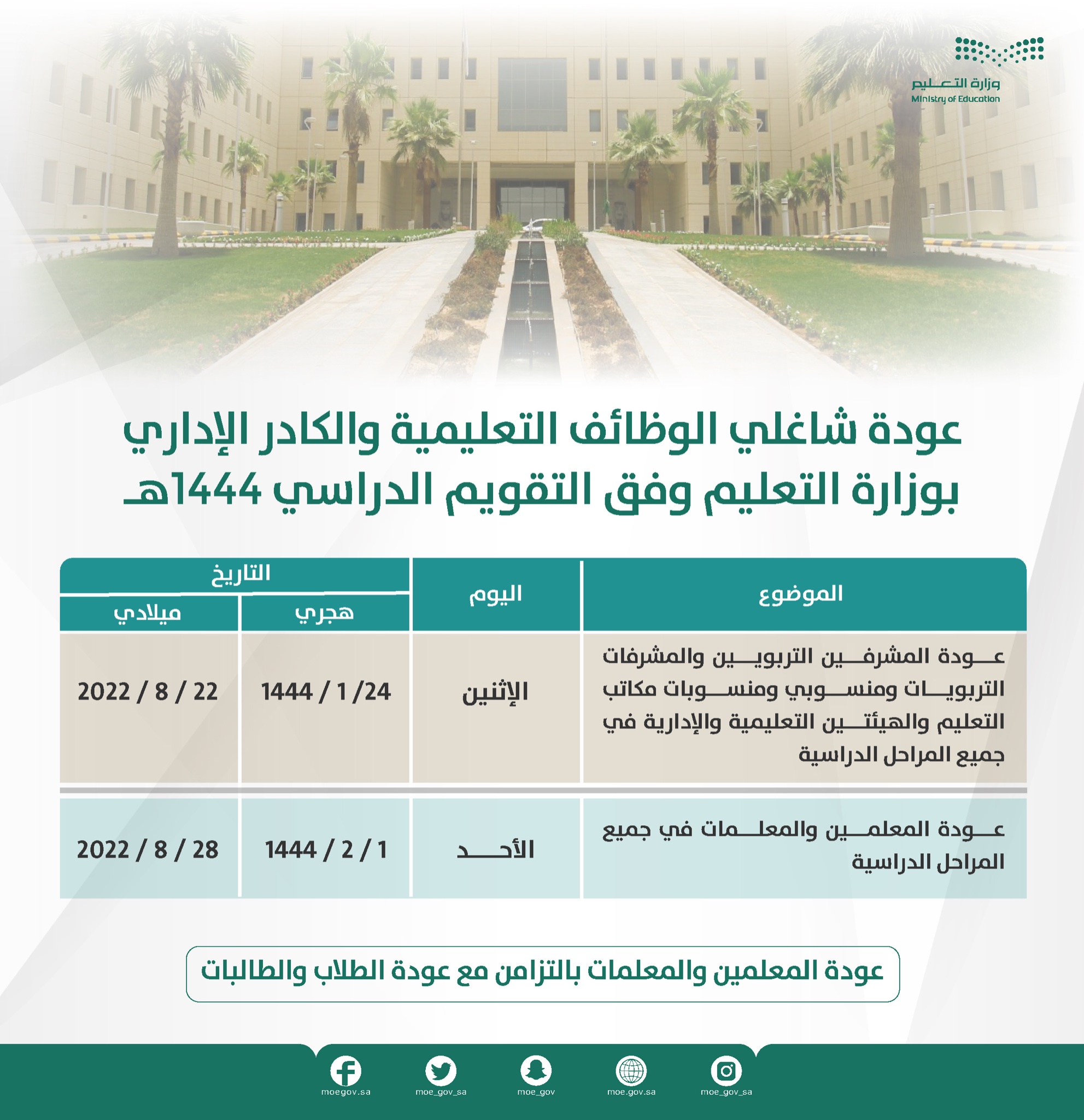 أعلنت وزارة التعليم عن مواعيد عودة شاغلي الوظائف التعليمية من المشرفين التربويين والمشرفات التربويات ومنسوبي ومنسوبات مكاتب التعليم والهيئتين التعليمية والإدارية في جميع المراحل الدراسية؛ لتكون يوم الإثنين 1444/1/24هـ الموافق 2022/8/22م، وعودة المعلمين والمعلمات للتدريس في جميع المراحل الدراسية؛ لتكون يوم الأحد 1/ 2/ 1444هـ الموافق 2022/8/28م، وذلك وفقاً للتقويم الدراسي الجديد للعام 1444هـ بالتزامن مع عودة الطلاب والطالبات.