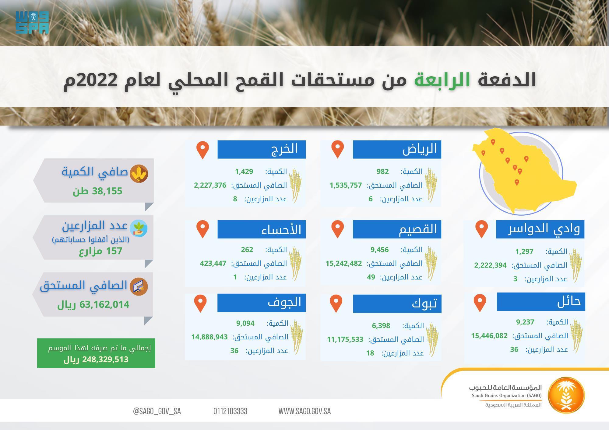 أعلنت المؤسسة العامة للحبوب صرف مستحقات الدفعة الرابعة من مزارعي القمح المحلي، شاملة الدفعة الثانية من مستحقي العلاقة التعاقدية بين المزارعين والشركات الزراعية، الذين قاموا بتوريد الكميات المخصصة لهم هذا الموسم 1444/1443هـ، وإغلاق الحسابات عبر المنصة الإلكترونية “محصولي” على الموقع الرسمي للمؤسسة.